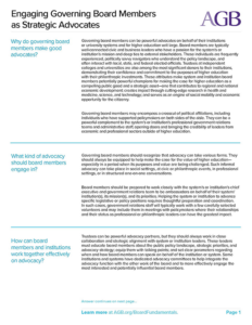 AGB’s Engaging Governing Board Members as Strategic Advocates and Engaging Foundation Board Members as Strategic Advocates offer practical guidance on involving board members in the advocacy strategy of an institution or foundation.