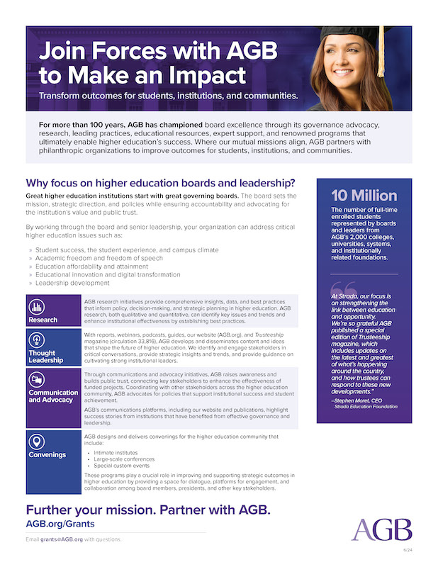 For more than 100 years, AGB has championed advocacy, research, leading practices, educational resources, expert support, and renowned programs that advance board excellence. By working with AGB, your organization gains a trusted higher education partner to impact boards and leaders from 2,000 institutions and institutionally related foundations, representing more than 10 million full-time enrolled students.