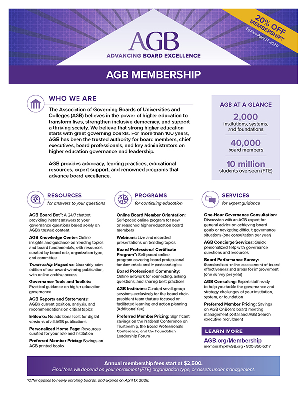 “AGB gives both presidents and boards the resources to know how to govern in the unique higher education environment. Their information is timely and actionable.”