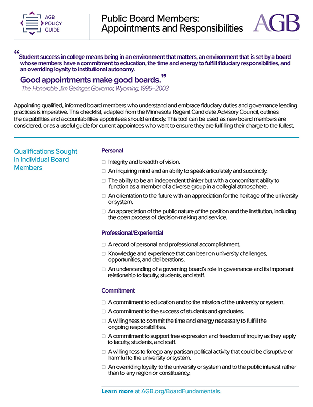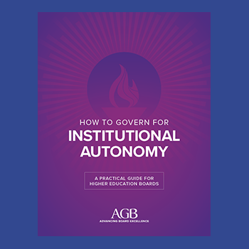 AGB successfully developed a deep understanding of the fundamental roles and responsibilities of governing boards through a century’s worth of research and direct engagement with governing boards and individual board members. As fiduciaries, board members are responsible for all aspects of the entity—the institution—they serve. This includes but is not limited to overseeing their institution’s mission, strategic planning, educational quality, and fiscal integrity. Fulfilling these essential responsibilities not only increases trustees’ sense of obligation as a board member, but also inspires governing boards to set high standards for the institution as a whole.