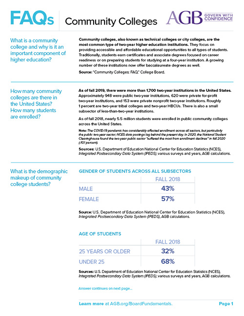 Governing boards of community colleges are legally and ethically charged with responsibilities for leading their institutions. This guide outlines those responsibilities and provides some benchmarks for board size and diversity.