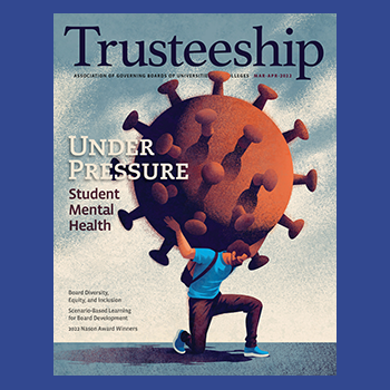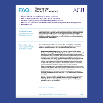 Colleges and universities must prioritize student wellness to ensure their campuses are safe learning environments. Meaningfully investing in programs dedicated to students’ physical safety and mental health demonstrates an institutional commitment to student wellness and decreases the risk of future student wellness crises. Governing boards are becoming increasingly engaged on this issue and must continue to support students by learning the scope of their institution’s wellness efforts as well as key areas for growth and risk prevention.