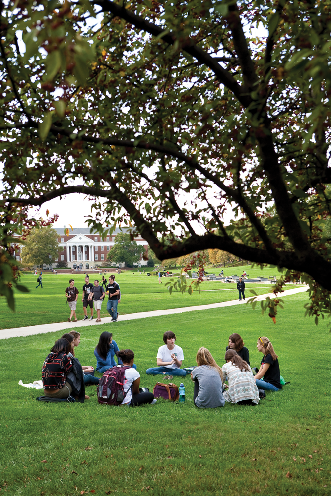 Students in an outdoor class at the University of Maryland, College Park enjoy the beauty of tree-lined McKeldin Mall.