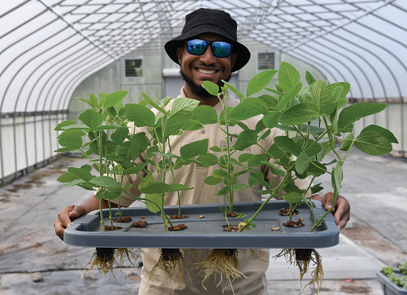 A student majoring in agricultural sciences at the University of Maryland Eastern Shore researches ethnic crop production in high tunnels using hydroponic techniques.