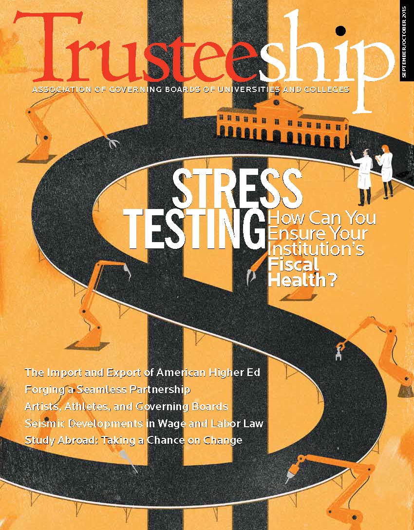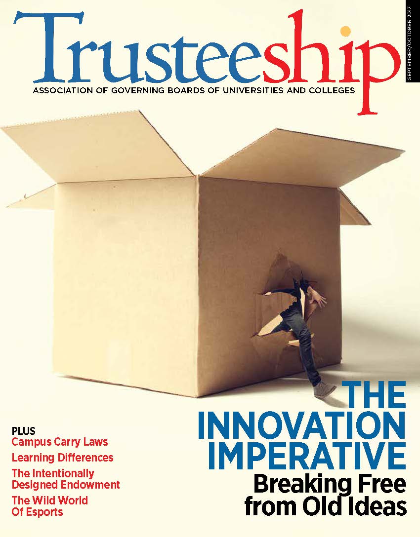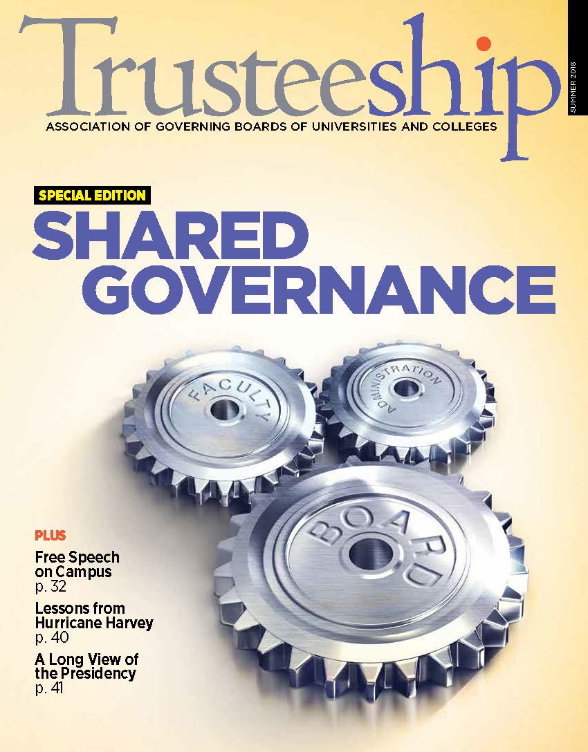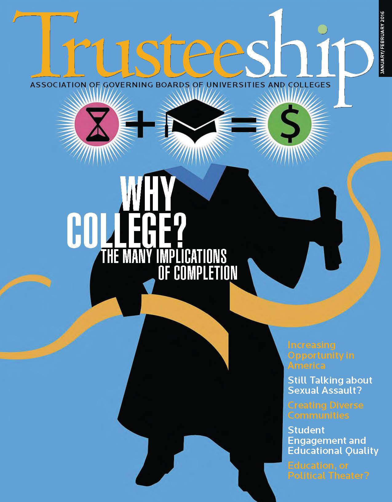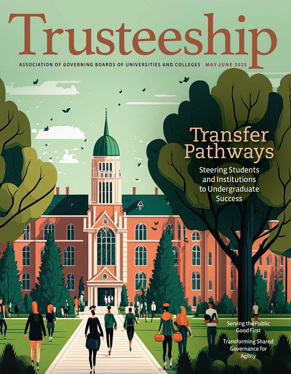 Trusteeship magazine reports trends, issues, and practices in higher education to help board members and chief executives better understand their distinctive and complementary roles and to strengthen board performance. It is published bimonthly for AGB members.