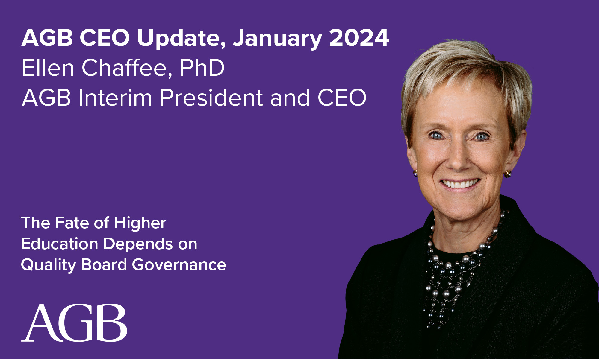 For 250 years, governance of American education at all levels has been of, by, and for the people. Citizens take fiduciary responsibility for higher education. AGB shares and supports your commitment. We have accepted the call to step up with you. In this video, you will hear from Ellen Chaffee, PhD, AGB Interim President and CEO, about our 2024 priorities.